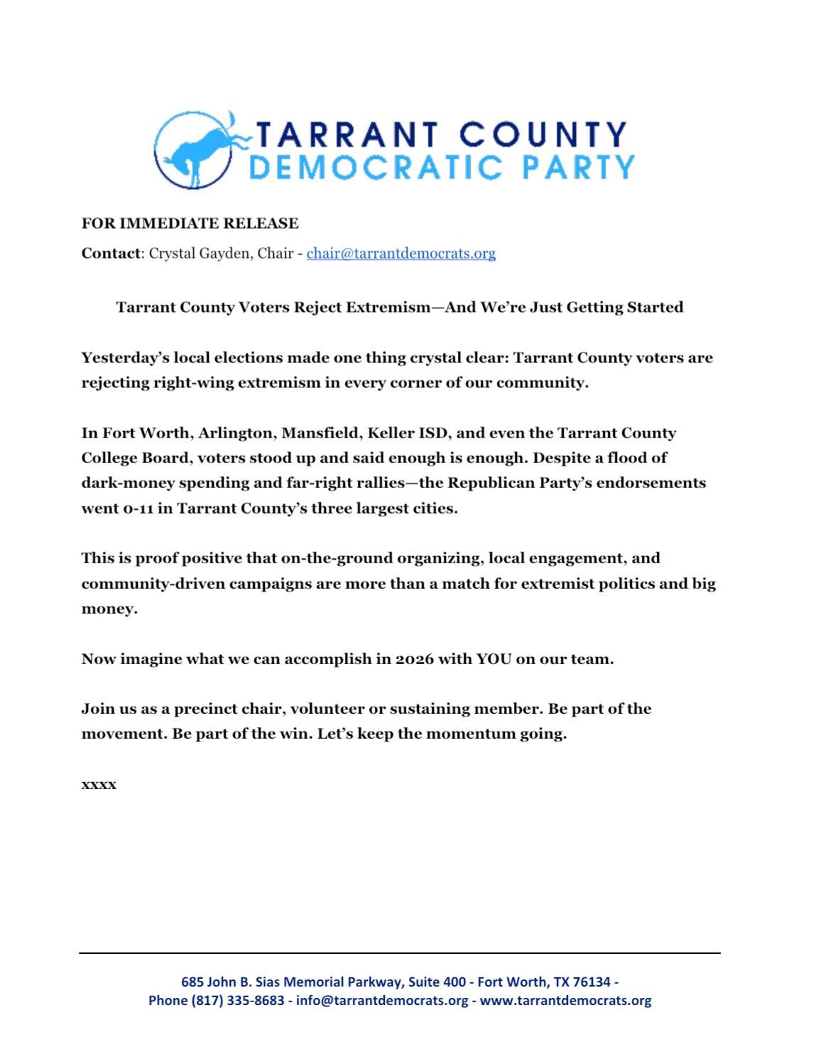 Huge, huge shout out to the Tarrant County Young Democrats. They didn’t just show up, they organized, knocked on doors, made calls, and fought for every single school board seat they were targeting. And guess what? They swept them all. That’s the kind of ground game that wins elections. That’s the kind of energy we need to keep building.