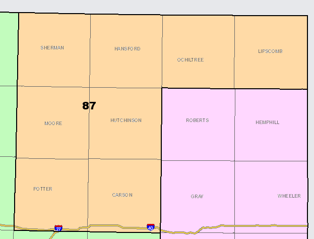 HD87 is more complicated than the topline suggests. The district is 54.3% non-Anglo overall, though the voting-age population is basically split down the middle, 50.1% Anglo to 49.9% non-Anglo. Hispanics make up about 40% of the total population. Potter County, which includes much of Amarillo in the district, is by far the biggest population center, and several communities in Moore, Ochiltree, Hansford, Sherman, and Lipscomb counties have very large Latino populations.