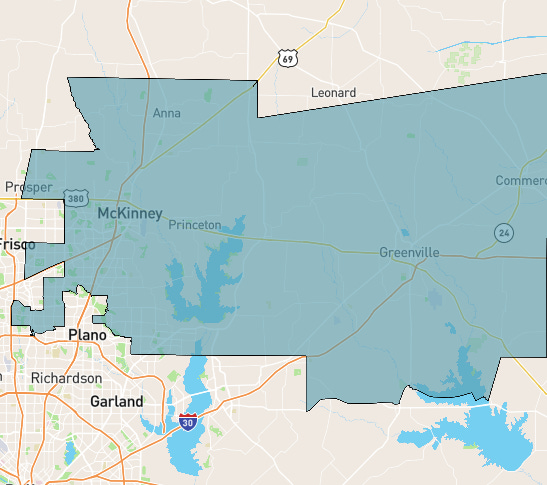 TX03 covers much of Collin County, as well as most of Hunt County. Cook PVI lists TX03 as R+10, which could indicate that it is vulnerable in a blue tsunami election. This district’s demographics are as follows: Anglo, 56%; Non-Anglo, 44% (Asian, 14.6%; Black, 11.1%; Hispanic, 16.2%; Black and Hispanic, 26.8%).