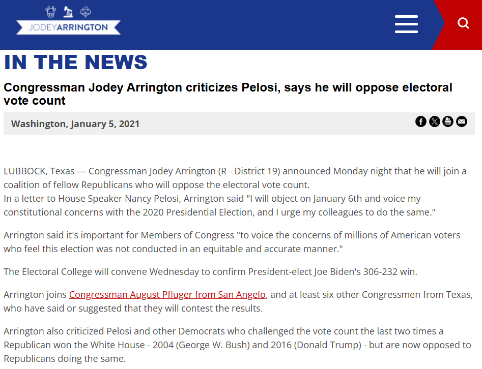 In late 2020, leading up to January 6th, Jodey Arrington was one of the treasonous seventeen from Texas who attempted to overturn the 2020 election.