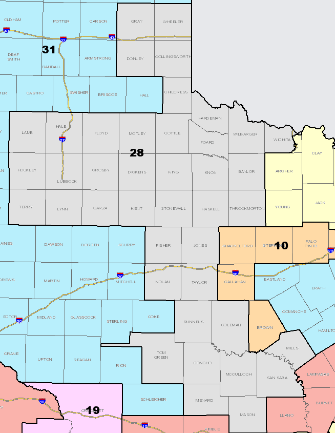 SD28 is a classic giant West Texas district. It is sprawling, rural, and culturally conservative, with population centers in places like Taylor County/Abilene and Tom Green County/San Angelo, plus part of Wichita County, surrounded by a long list of smaller counties that lean older, whiter, and more Republican. On paper, the district is still majority Anglo. The voting-age population is about 58.1% Anglo, 29.9% Hispanic, 7.4% Black, and 36.8% Black + Hispanic combined. That matters because this is not some monochrome district, but it is still built in a way that gives Republicans a structural edge.