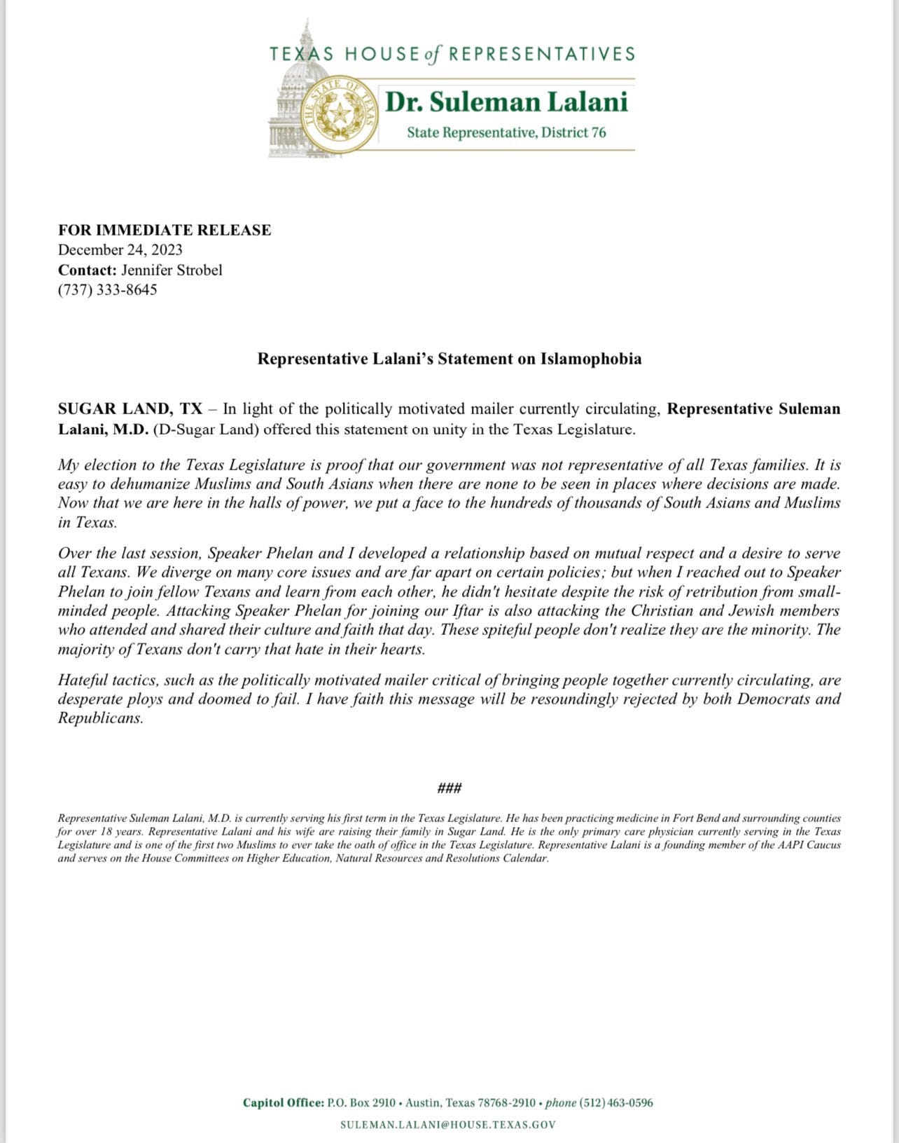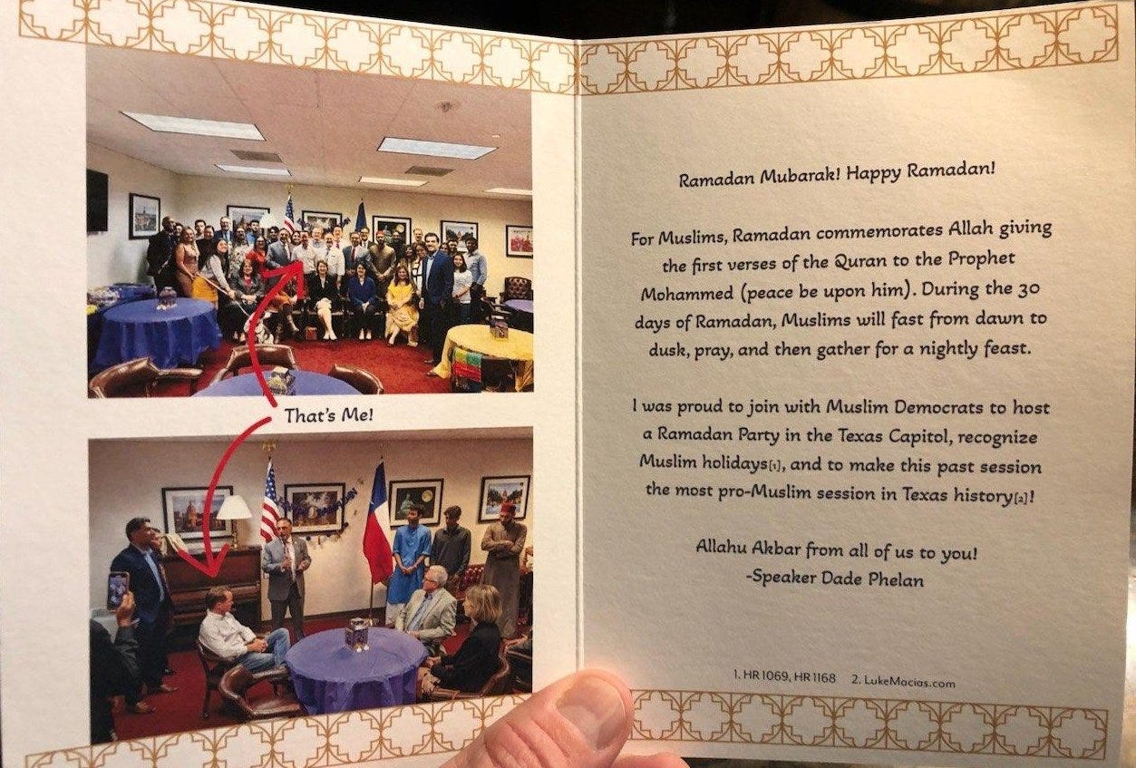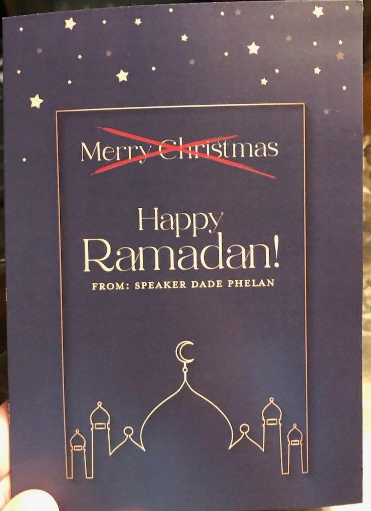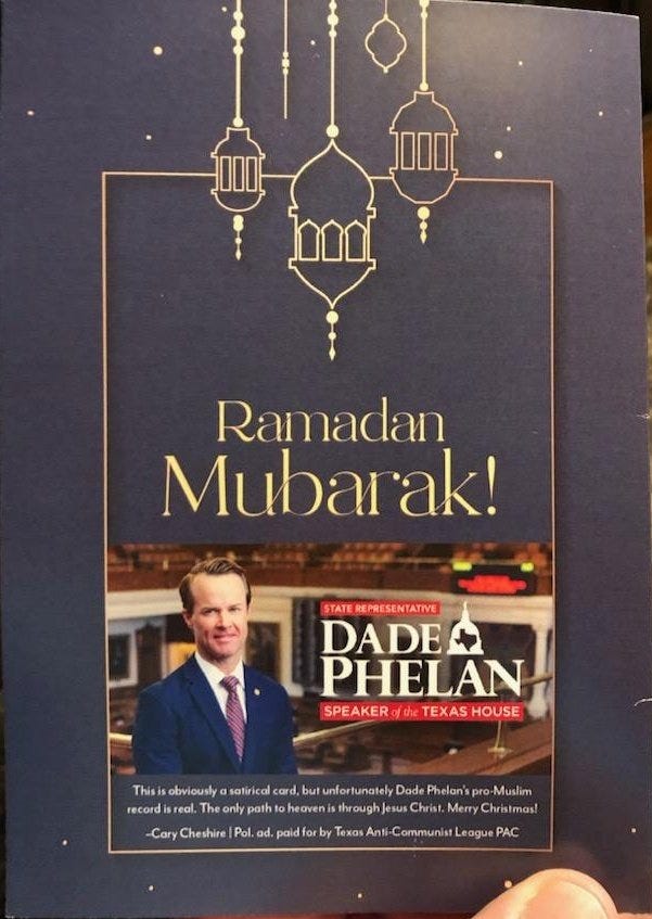 In the days before Christmas, voters in Speaker Dade Phelan’s district received cards suggesting Phelan canceled Christmas in favor of Ramadan.