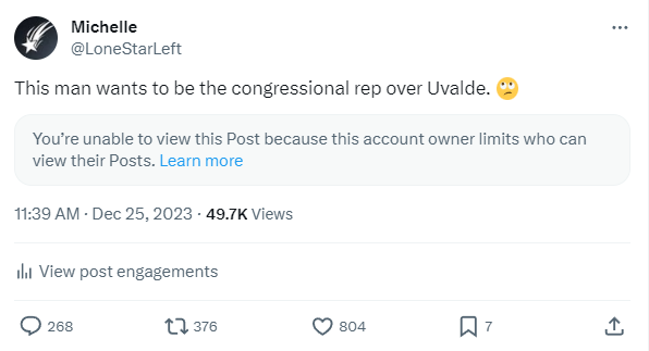 This is the man who is running against Tony Gonzalez (R) in TX23, the same one that left an inactive explosive device in Uvalde last week. The ‘AK Guy,’ who has built his persona upon a fascination with AK47s and AR15s—the very instruments of such unimaginable sorrow in Uvalde—now seeks a congressional seat in the same grief-stricken community.