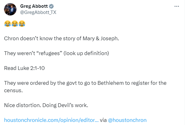 The Houston Chron published an editorial about Mary, Joseph, and Baby Jesus called, “Two thousand years ago, a young family became refugees.” And Abbott responded.