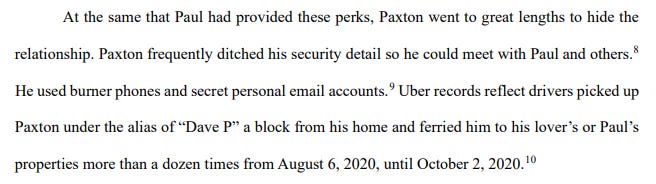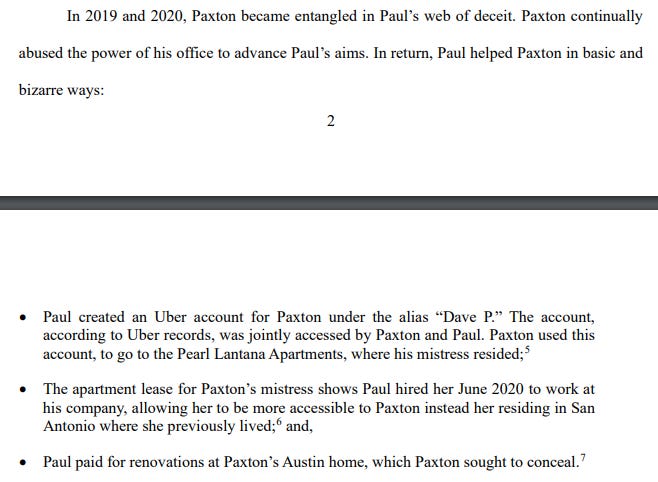 There is quite a bit in these documents about Paxton’s relationship with Nate Paul, the extent of their ties, and how Paxton benefited from helping Paul. But, in response to the Motion to Dismiss, based on the so-called ‘Forgiveness Doctrine,’ there were also more sensational details about Ken Paxton’s affair with his mistress.