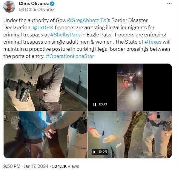 Chris Olivarez, a lieutenant with the Department of Public Safety, posted on social media Wednesday evening that Texas DPS troopers are arresting refugees at the border and charging them with criminal trespassing.