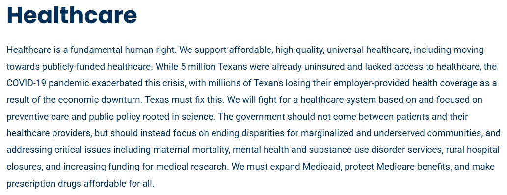 This is evident from the Texas Democratic Party platform, which is the most progressive state party platform in the United States.
