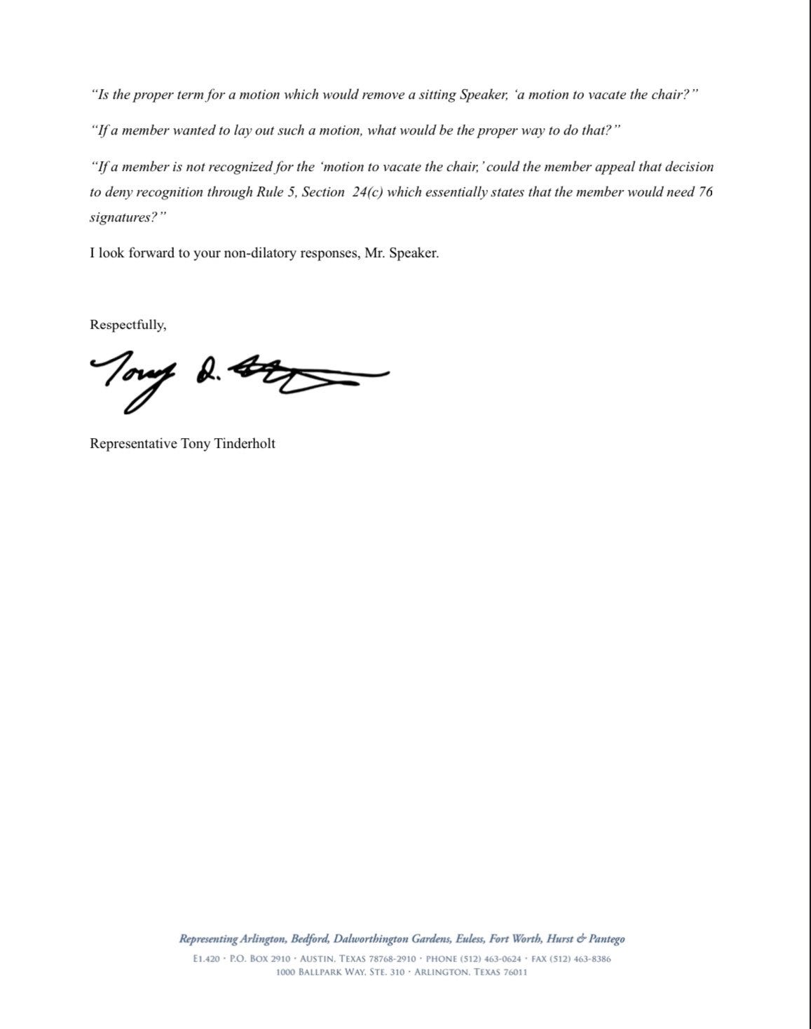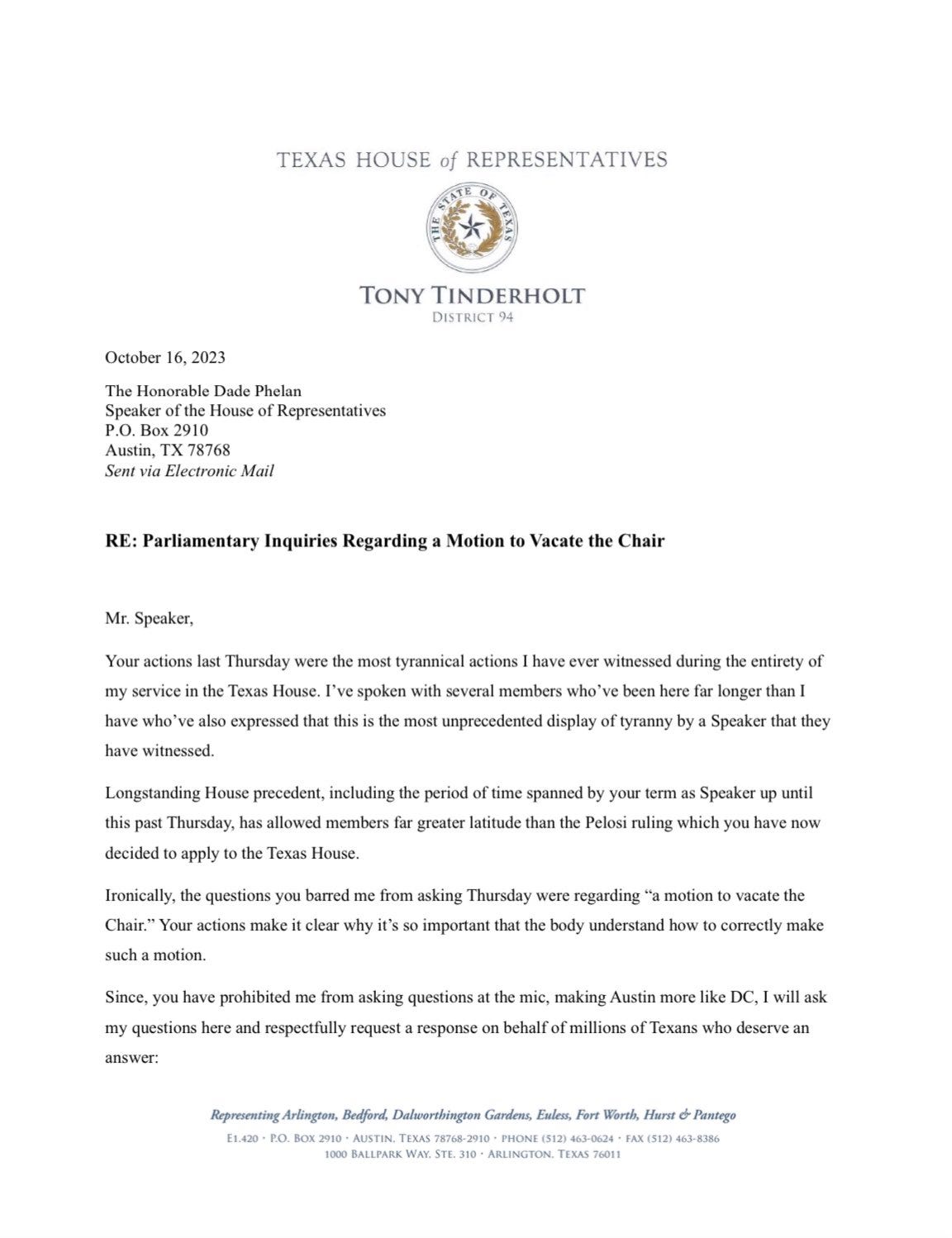 Tinderholt started his letter with, “Your actions last Thursday were the most tyrannical actions I have ever witnessed during the entirety of my service in the Texas House.”
