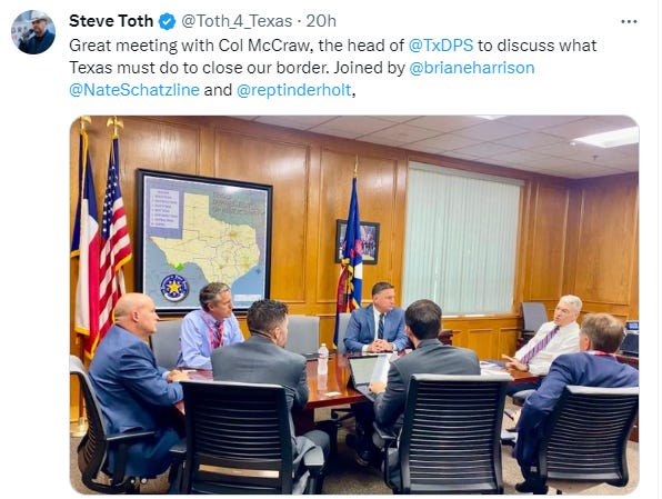 Also, yesterday, the four group members took it upon themselves to meet with Steve McGraw from DPS about the border. As members of the Legislature, they can meet with any Texas official at any time. However, it’s interesting that these four have consistently banded together on issues and were in this meeting yesterday.