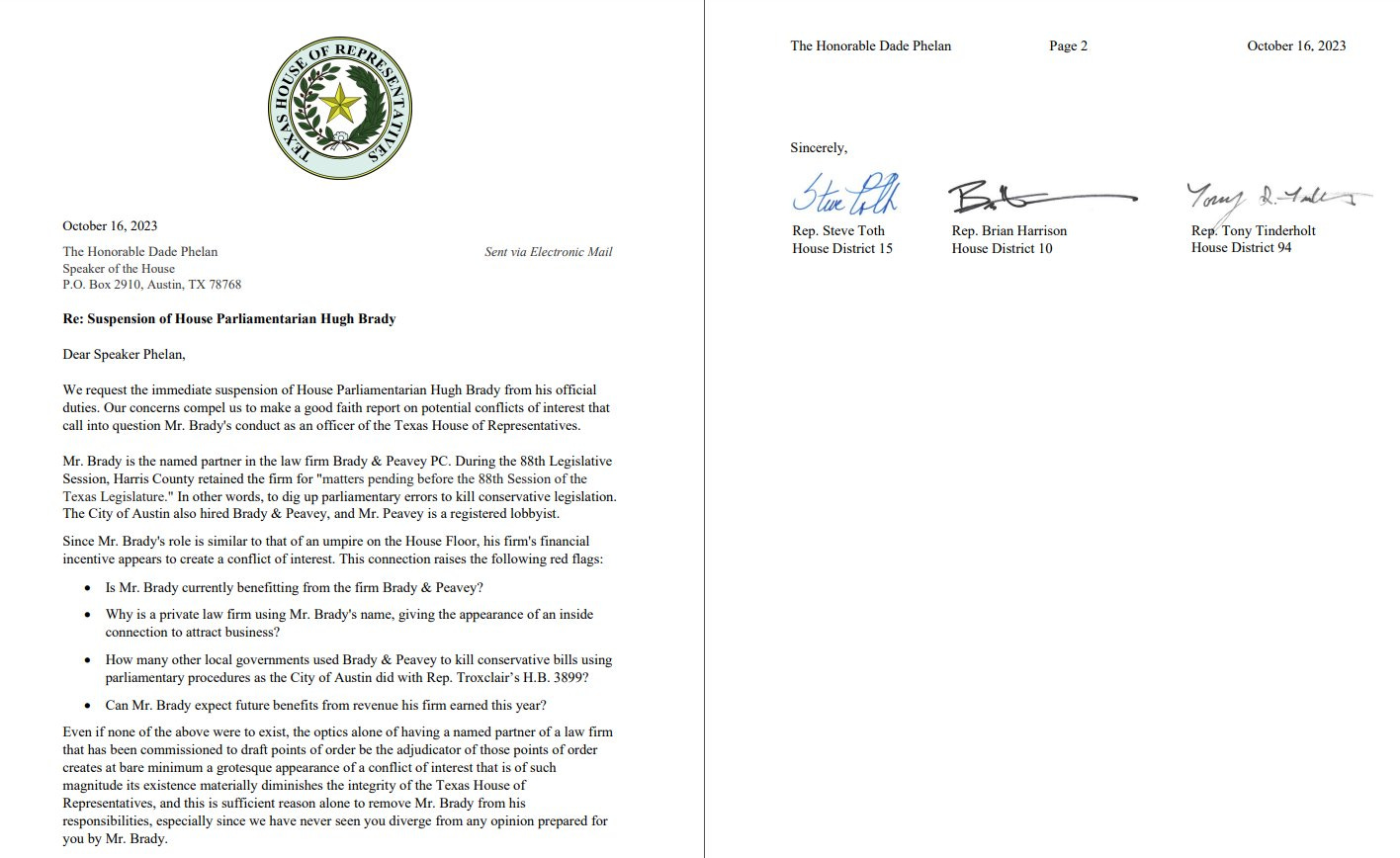 I expect Dade Phelan will not answer this letter. I also suspect that Tinderholt will not have the support in the House to remove Tinderholt.
