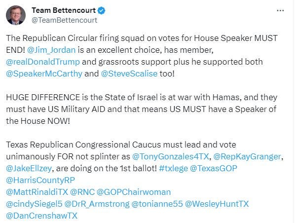 After the losing vote today, it’s rumored that Jordan will lose support. But maybe they’ll go back to the floor tomorrow and try again. It’s remarkable that the GOP in our nation’s capitol is so divided and can’t come together even to pick a leader. It mirrors the chaos we’ve been seeing in Texas this year.