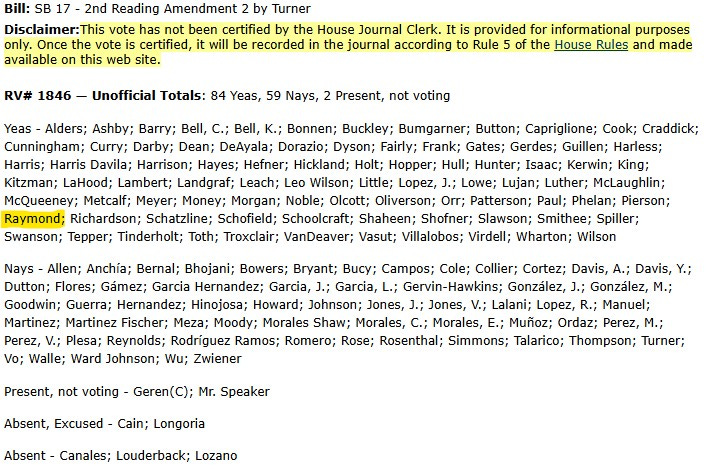 Every Republican and Richard Raymond (D-HD42) voted for it.