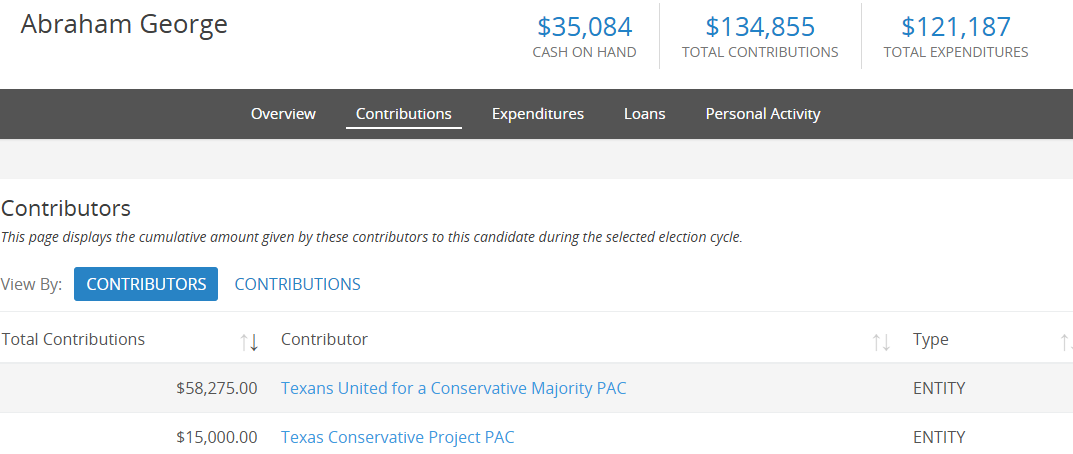 This primary race donation indicates that RPT Chairman Abraham George is in bed with Tim Dunn like so many other Republicans easily bought off.