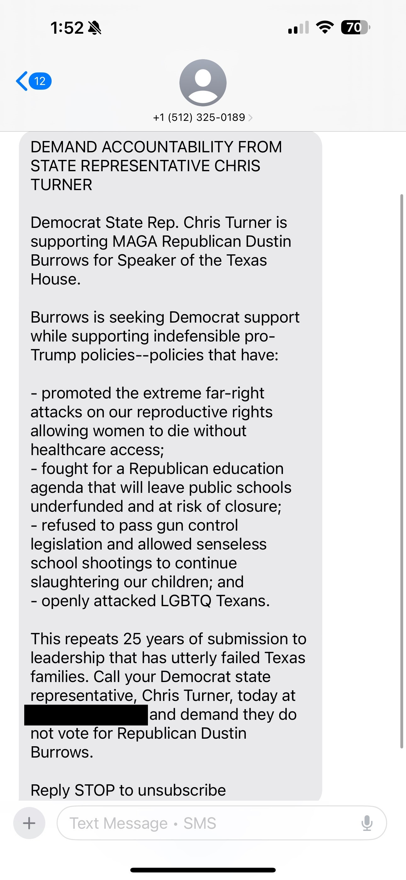 It did not include a name or group affiliation, which prompted me to make phone calls yesterday to determine where it originated. I had never received an anonymous political text, which is so shady. I learned yesterday that most Democrats in Texas use the same texting service, which requires them to say who the text is from under its Terms of Service.