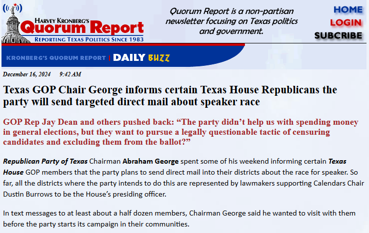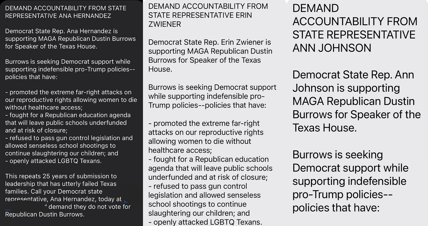 While the Quorum Report states Abraham George, the Republican Party of Texas Chairman, will send direct mail (paper in your mailbox) to the districts of the GOP members who are supporting Burrows, we shouldn’t discount the possibility that these text messages to Democratic voters came directly from the Republican Party.