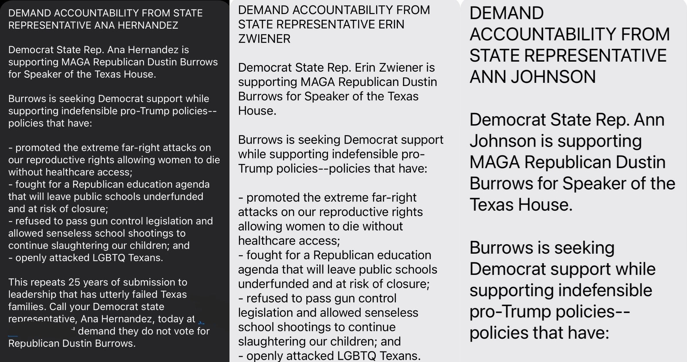Yesterday, Democratic voters in Democratic House districts across the state received text messages urging them to demand that their House Representatives not support Dustin Burrows for House Speaker.