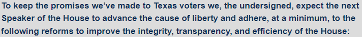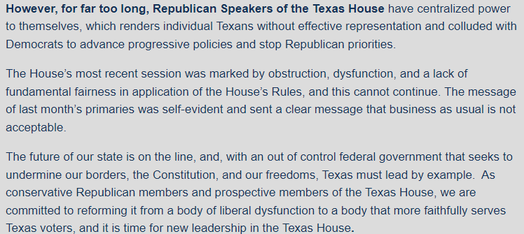 The short of it is that if Democrats are successful in flipping several seats this November, the Contract On Texas will be like 25 asshole Republicans against 75 Democrats and 56 Establishment Republicans willing to act in a bipartisan way.