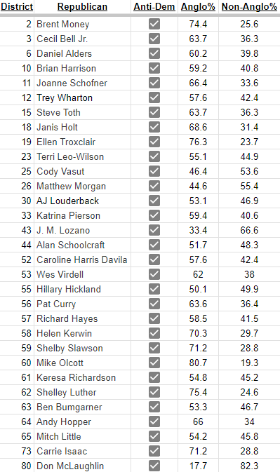 During the session, when they redrew the maps, they drew them to maintain political power but made no efforts to expand their Republican majority. They did this simply because there was no more pie to slice up. That is why most districts are only a sliver more Anglo than Non-Anglo because the majority of white voters are Republicans, and this keeps Republicans in power. “Color blindness.”