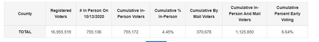 I do not think we’ll hit the 1.1 million in-person + mail-in vote record we set in 2020. We’ll probably come close, but due to COVID-19, there were likely many more mail-in votes in 2020. That’s okay because our in-person voting for Day 1 will likely be close to 1 million, a new record.