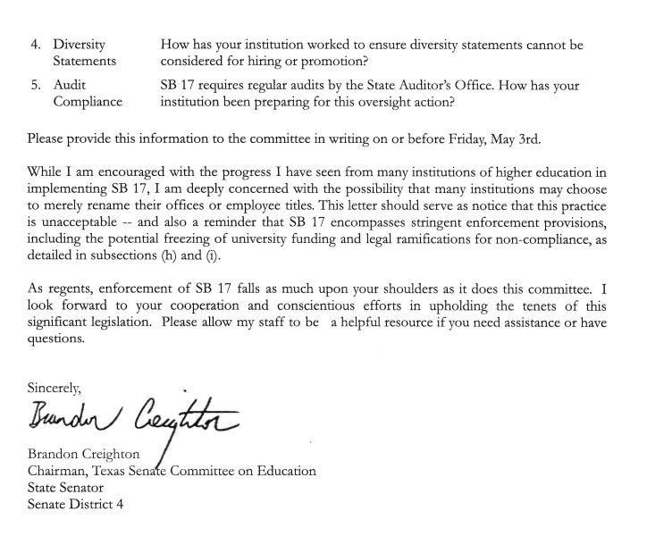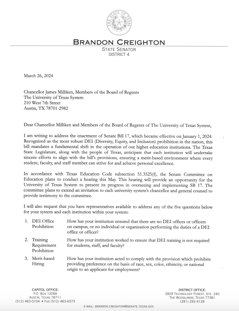 Yesterday, Creighton called for a hearing to ensure public universities followed his DEI ban. In the notice for the hearing, he asked five questions and for the answers to be provided by May 3. Those five questions were: