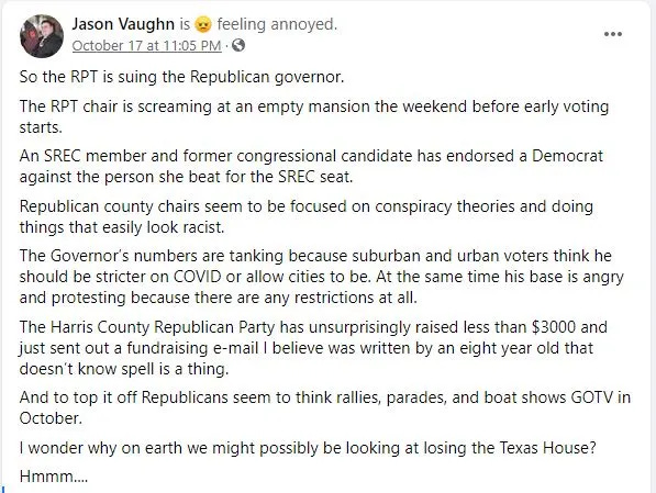 I noticed long before the 2020 election how much of the Texas GOP was in chaos. The term “RINO” was thrown around more and more. And just like everything else, Covid exacerbated it.