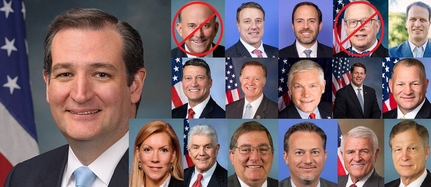 Of those 147 Republicans, 17 of them were from Texas. 16 Congresspeople and one Senator. All of them are still in office except for Louie Gohmert and Ron Wright.