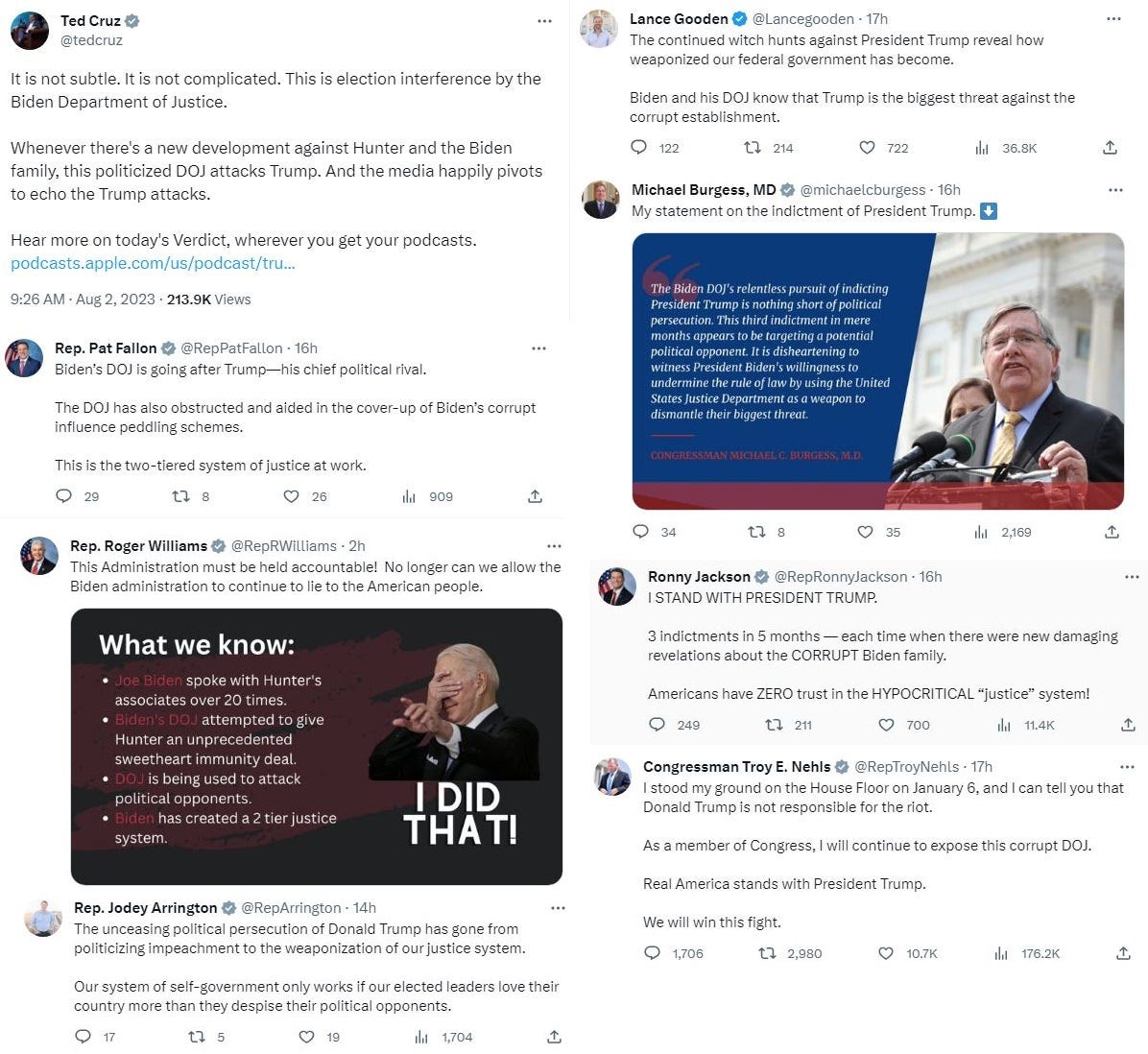Senator Ted Cruz and Congresspeople Pat Fallon, Lance Gooden, August Pfluger, Ronny Jackson, Randy Weber, Pete Sessions, Jodey Arrington, Troy Nehls, Beth Van Duyne, Roger Williams, Michael Burgess, Michael Cloud, John Carter, and Brian Babin are all traitors to democracy. In Congress, they work diligently to spread lies and misinformation and take away your rights.