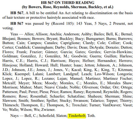 Then, when Rhetta Bowers passed the Crown Act, Tony Tinderholt (R) was one of the few Republicans to vote against it. This bill was to prevent discrimination against Black people for their hairstyles.