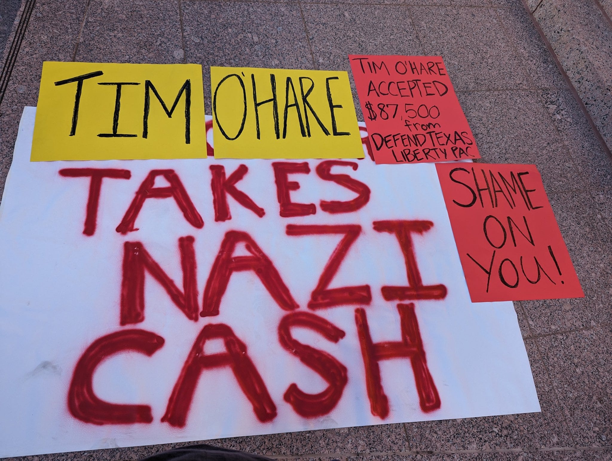 These signs are from a protest in October when Tarrant County residents learned that County Judge Tim O’Hare took large amounts of money from the Defend Texas Liberty PAC. O’Hare still has not denounced Nazis or the Defend Texas Liberty PAC.