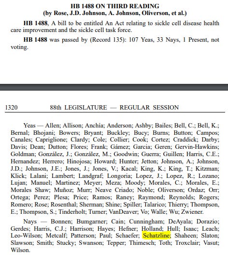 Last year, Toni Rose (D) passed bill 1488, addressing disparities in sickle cell disease awareness. This bill was to help Black people in Texas directly. Luckily, it passed and was signed by the governor, but multiple Tarrant County Republicans voted against it.