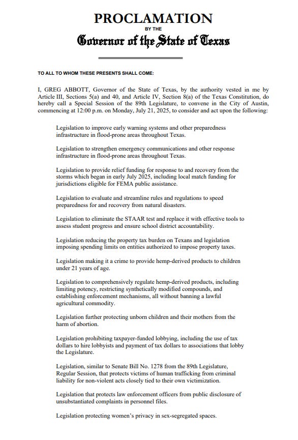 Not the flooding. Not the failure to warn. Not the redistricting. Not the bills to protect billionaires while the rest of us drown, literally and politically. What we’re watching in real time is a government more interested in power than protection, more focused on political maps than flood maps, and more concerned with performative cruelty than public safety.