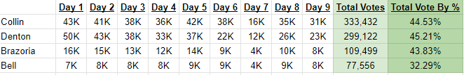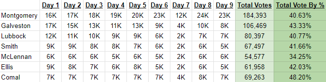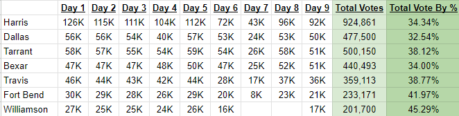 I included Williamson County because they went blue in 2020, and we should see them be blue again this year. (I know I’m missing two days there. It’s because the Secretary of State hadn’t posted those days—they’ll catch up.)