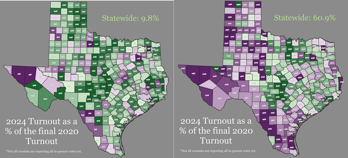 Comal County, a traditionally red area, has seen turnout way above average. It’s hard to say why or if it’s an outlier. Senator Ted Cruz and Congressman Chip Roy have held multiple rallies in Comal County in the last month, which may be why we’re seeing such a large turnout there. This is Chip Roy’s district, and he needs to counterbalance the votes that will be against him in Bexar and Travis County.