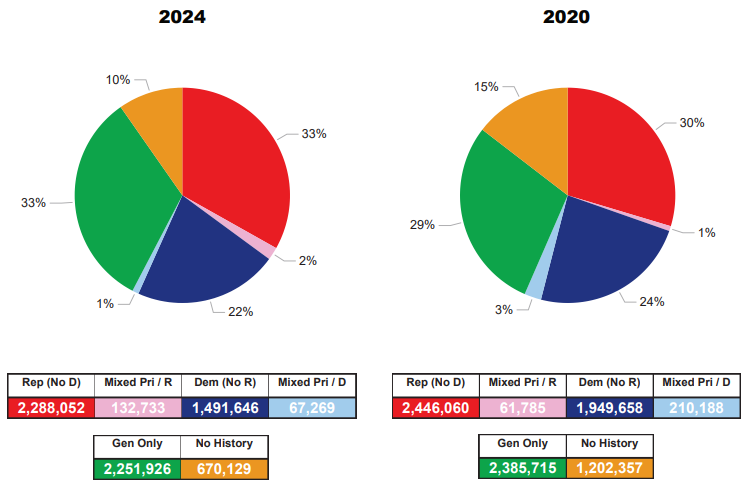 Further, Ryan Data’s comparison between 2024 and 2020 shows that the number of voters who vote in Republican primaries isn’t far off from where it was in 2020, possibly indicating that the “Mixed Primary/R” is more likely to be the Democrat who votes in Republican primaries. That’s my takeaway.