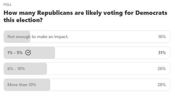 How many “crossover” votes will we see in this strange and abnormal election? I asked y’all that the other day and 54% of you think it’ll be more than 5%.