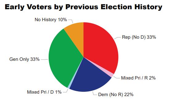 He’s showing the breakdown of early voters based on their previous election history. His methodology shows that 33% of the voters who already cast a vote have previously voted only in Republican primaries, and 22% previously voted in Democratic primaries.
