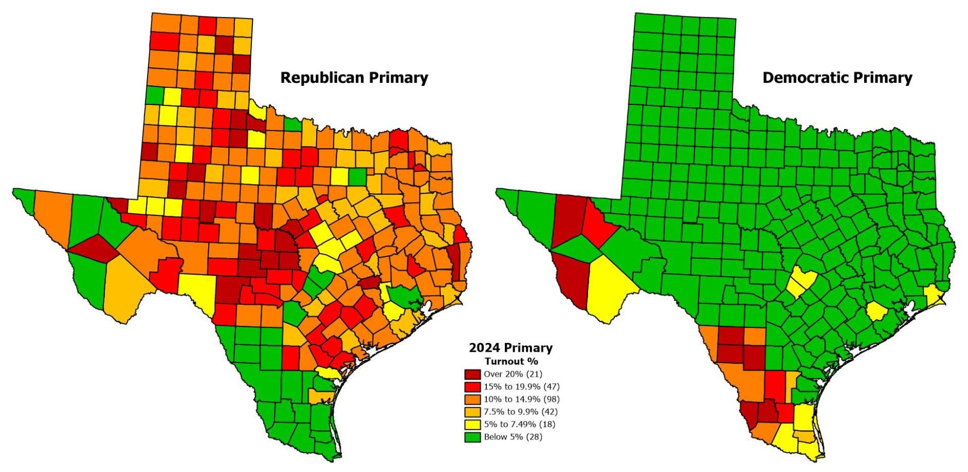 Republicans’ higher turnout in primaries can be attributed to several factors, chief among them being the long-standing control they have held over Texas politics. This control transforms Republican primaries into pivotal events, often seen as the de facto decision point for who will hold many of the state’s elected positions. Here’s why: