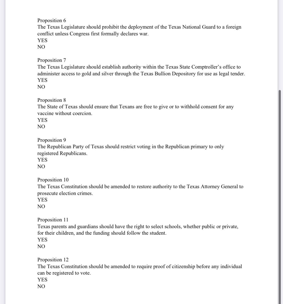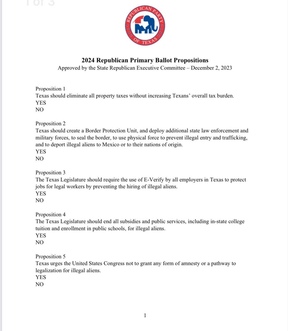 Today, the Texas GOP published their ballot initiatives, which will be on the March 2024 Republican primary ballot. The ballot initiatives are racist, unhinged, and based on conspiracy theories. At this point, we shouldn’t expect anything less from the Republican Party of Texas.