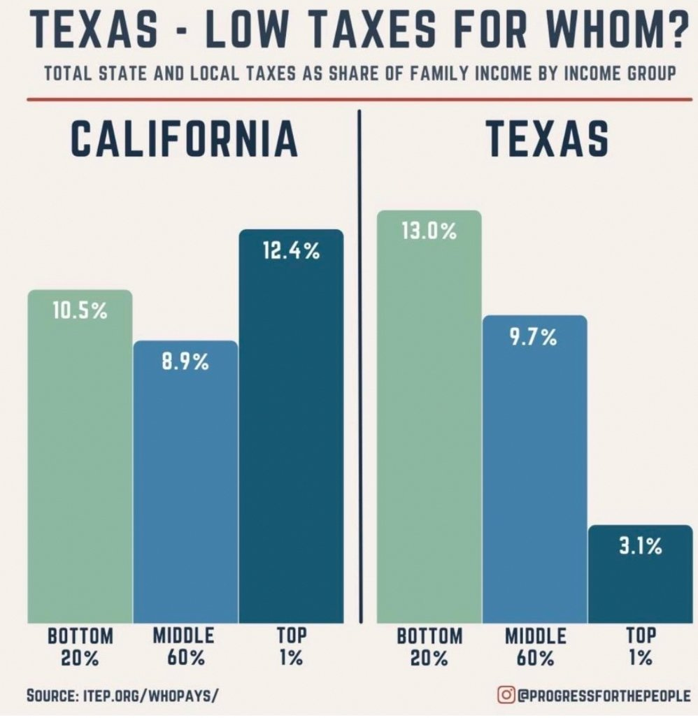 In Texas, we already tax low-income individuals at a much higher rate than the wealthy. While taxing the rich might be a possible solution, but Texas voters just voted to prohibit wealth taxes. (Which was stupid, beyond belief.)
