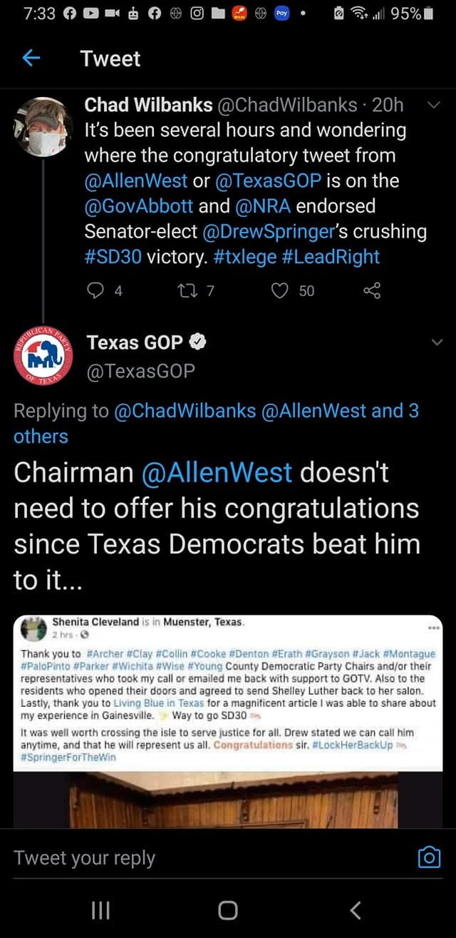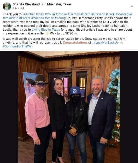 In 2020, when I was still writing for Living Blue in Texas, I wrote several articles about Shelley Luther (R) v. Drew Springer’s (R) election, urging Democrats in SD30 to vote for Springer over Luther because Luther was a racist, Trump-backed b-word.