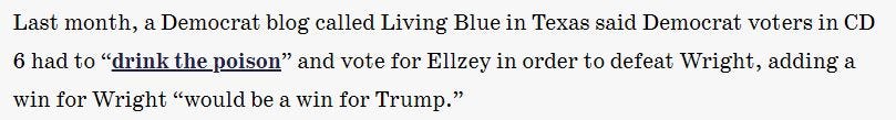 Then, in 2021, in a runoff election for Texas’ Congressional District 06 between Susan Wright (R) and Jake Ellzey (R), I wrote another article encouraging Democrats in TX06 to vote for Ellzey over Wright because Wright was a Trump-backed candidate who vowed to continue her husband’s work.