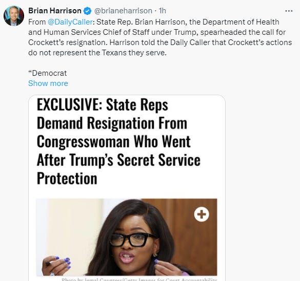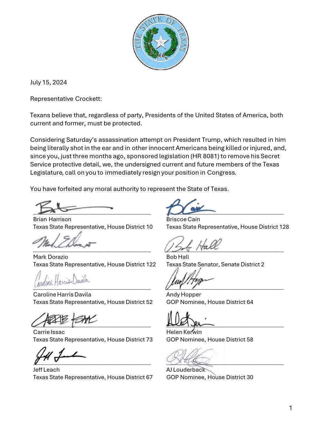 However, some Texas Legislative Republicans, all of whom are white, are now using the attempted assassination of the orange one to target Jasmine Crockett and demand she resign.
