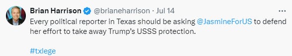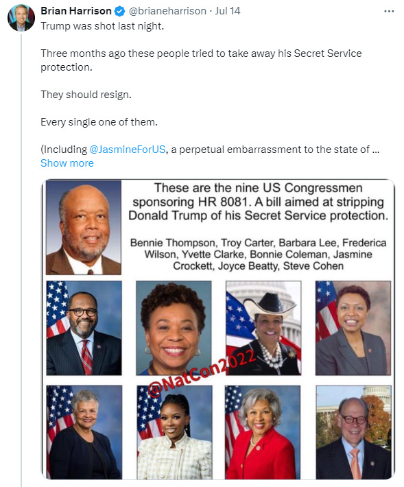 They are linking this bill to the assassination attempt over the weekend, insinuating that Jasmine Crockett tried to make it so Trump would have had no Secret Service protection this weekend if the bill was successful, instead of what the bill is ACTUALLY about, which is what happens AFTER a person with a Secret Service detail goes to prison.