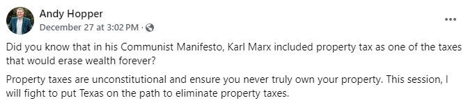 Hopper isn’t making a principled case for tax reform. He’s angry that he must pay taxes on his million-dollar, 10-acre farm. Rather than articulating a substantive critique of property taxes or offering realistic alternatives, he parrots half-baked propaganda slogans like “we’re renting from the government” and “Karl Marx wanted this.” He doesn’t even bother to connect the dots or offer solutions that would work for the average Texan.