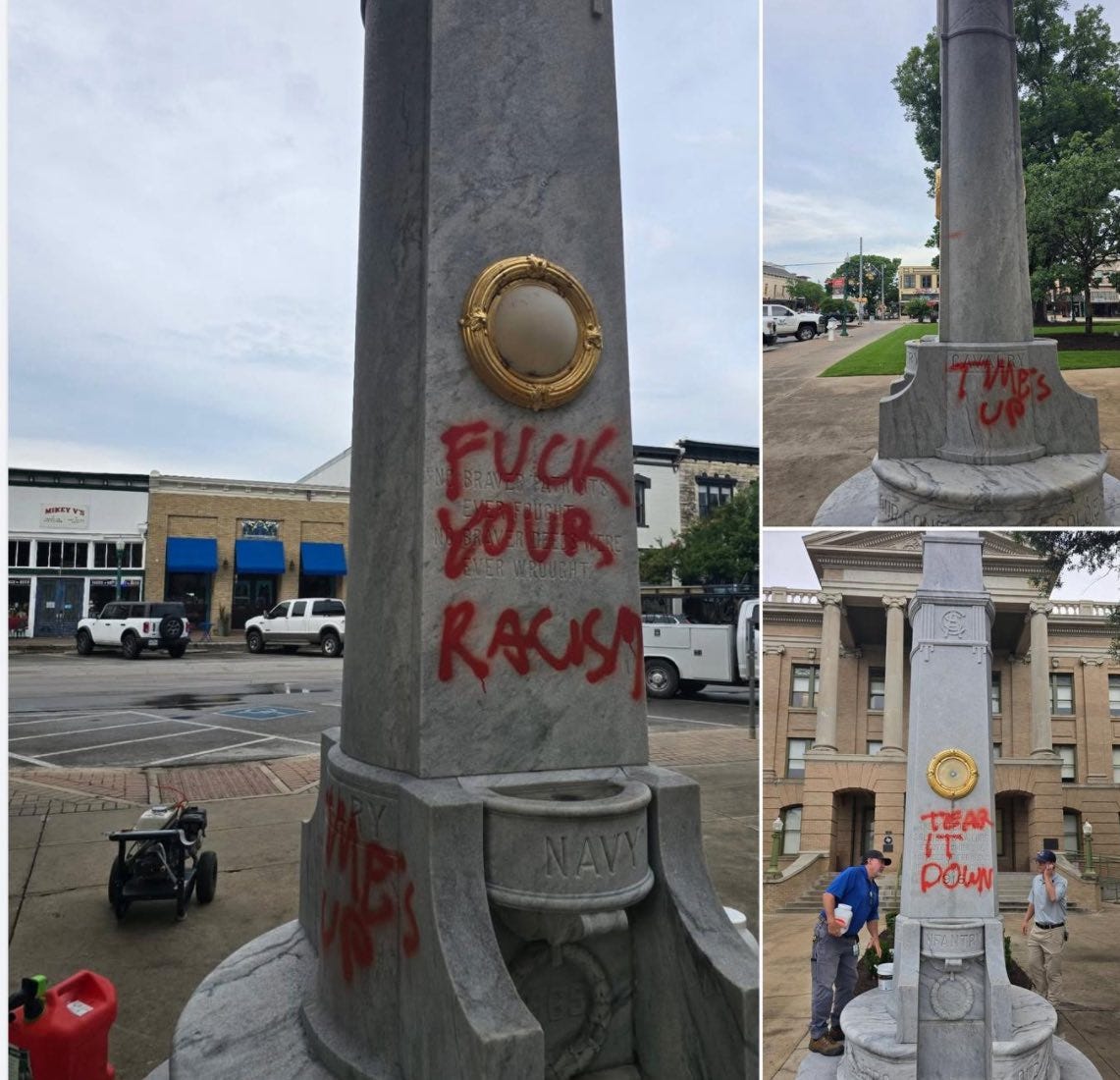 Local activist group Wilco Patriots, who’ve been leading the fight to respectfully have this ode to white supremacy removed through protests, petitions, and commissioners’ requests, made a statement on Facebook distancing themselves from the defacement: