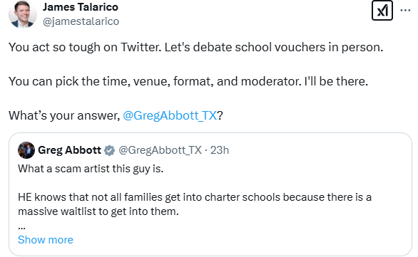 Talarico wasn’t playing games and responded to Abbott, “You act so tough on Twitter. Let’s debate school vouchers in person.”