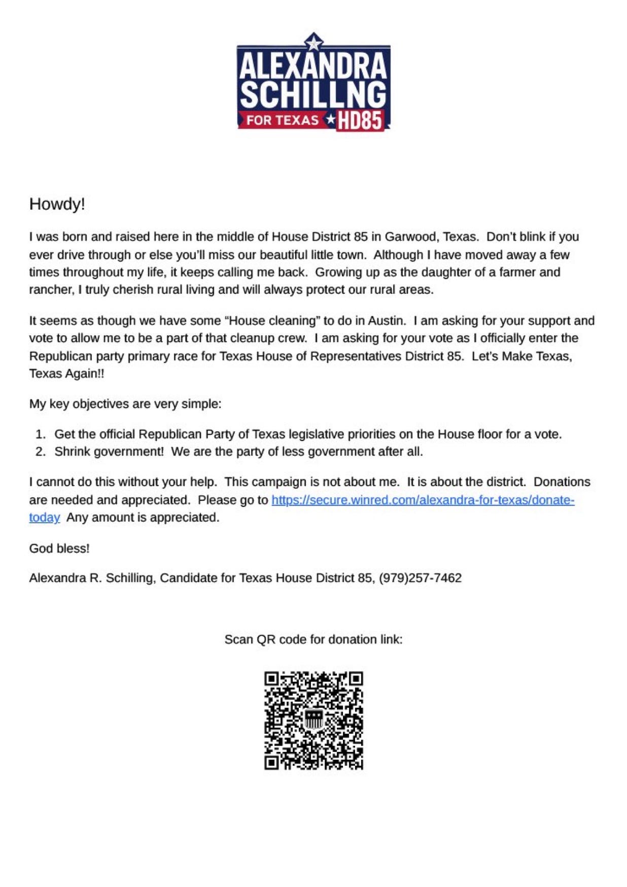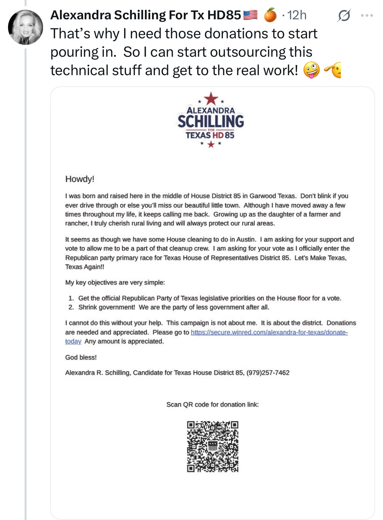 Introducing “Alexandra Schilling,” a Republican slated to run for HD85. She misspelled her OWN name in her campaign logo: