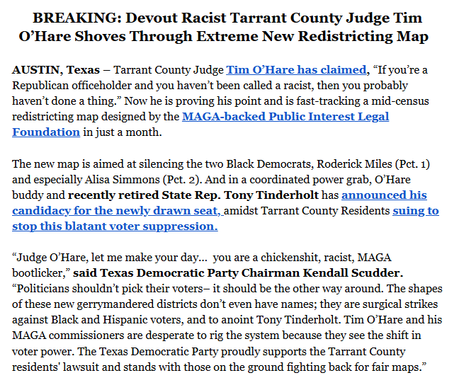 Long story, short, the Republicans are redistricting the County Commissioners Court to eliminate the Black representation we have. It’s racist, it’s ugly, and while this was going on, this video of Judge Tim O’Hare has surfaced (less than one minute- Source: Chris Tackett, filmed initially on The Wolf and The Shepherd podcast):