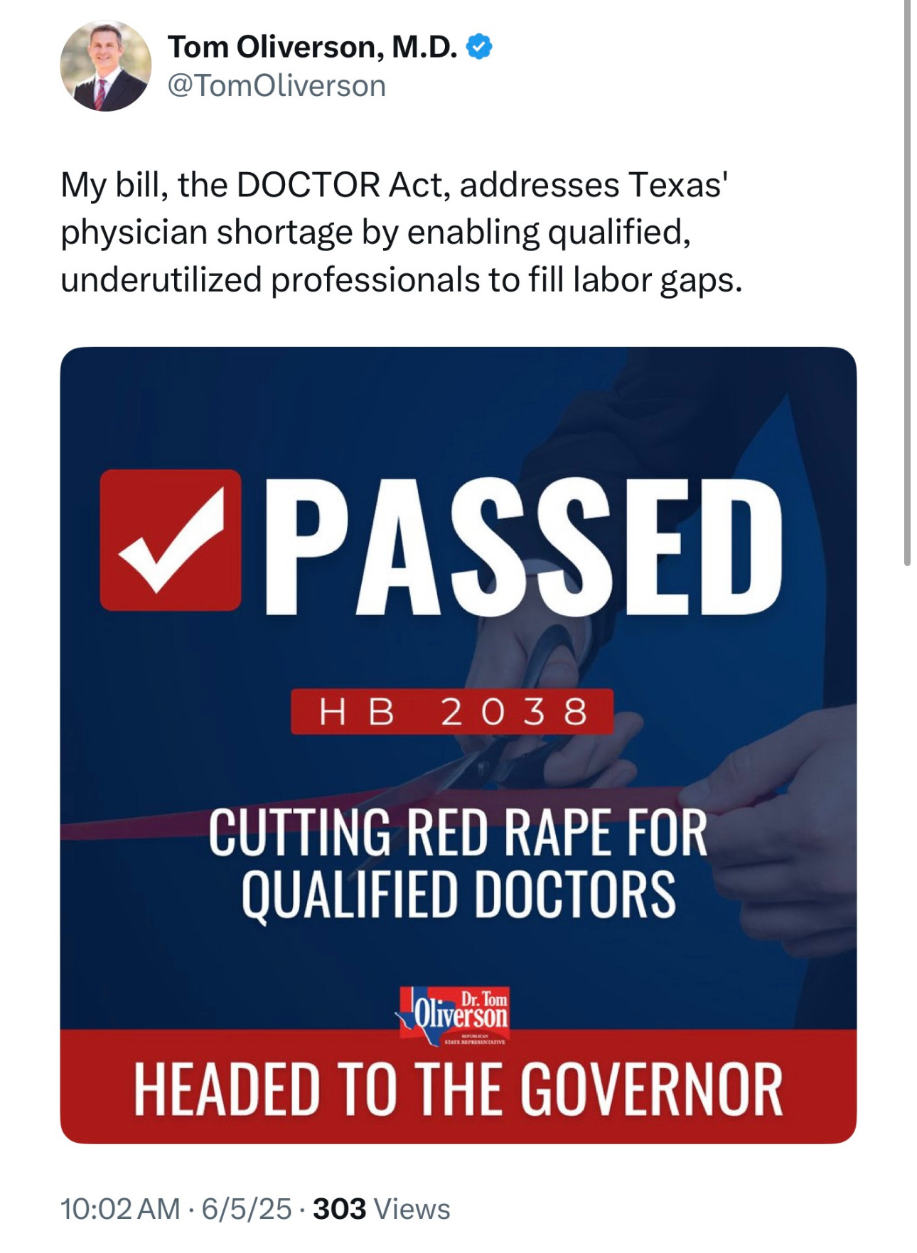 This week, Oliverson boasted about cutting RED RAPE for doctors.