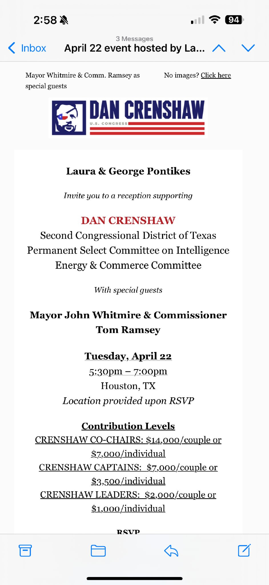First, screenshots leaked showing Whitmire as a special guest at a high-dollar fundraiser for none other than Congressman Dan Crenshaw (R-TX02). Crenshaw has spent years bashing progressive policies, demonizing immigrants, and parroting MAGA talking points. So what’s Houston’s so-called Democratic mayor doing lending his name (and presence) to Crenshaw’s event?